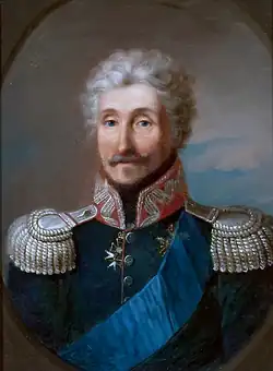 In 1802 Zajączek became the commander of the French 2nd Division.[48] In 1803 he received the Knight's Cross of the Legion of Honour; a year later, the Commander's Cross.[49] In 1805 during the War of the Third Coalition he was assigned to the French Army of the Rhine, where he worked at army's High Command.[50] Next year in September, during the War of the Fourth Coalition, he was assigned to command of the foreign (mostly Polish) Northern Legions; in the following month he organized another similar unit, the Kalisz Legion.[51] In 1808 those units were reorganized into parts of the Army of the Duchy of Warsaw, in which Zajączek became a general.[51][52] During that time, dissatisfied with his transfer from the French army, and being made subject to Prince Józef Poniatowski whom he disliked, he refused to wear a Polish uniform and swear an oath to the Duchy, and was forced to do so only on direct orders of French marshal Louis-Nicolas Davout.[53][54] In 1809 he commanded several formations in the Polish–Austrian War,[55] where he failed to distinguish himself, instead suffering the only significant defeat in this campaign at the battle of Jedlińsk on 11 June.[56] He remained in the Army after the war, commanding the Polish 2nd Division, and organizing the troops for the expected conflict with Russia.[57]