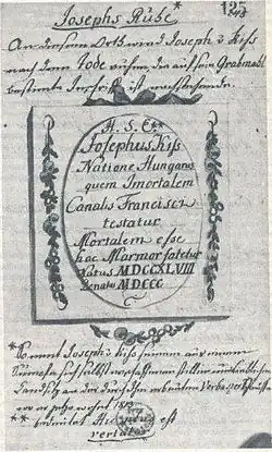 Here lays József Kiss, a Hungarian noble. He is immortal, for the Franz channel stands. He is mortal, for this cold marble. He was born in Buda 14 days before the April calends of 1748. He died in Sombor, among his friends from Bačka, on the third day of the March idas of 1813.
