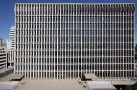 The building is a single rectilinear volume set on a podium-like ground floor, surrounded by a concourse. The exterior walls are concrete, and the ground floor is polished granite.[3] All four sides of the building are wrapped with a uniform exterior grid that frames the window openings with rows and columns of T-shaped concrete sections.[3] The concrete openings taper to create a vertically oriented oblong hexagonal shape. This strategy "both softens and animates the building with enriched patterns of light and shadow".[1]