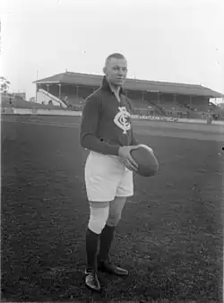 Unusually for his era, he sometimes took set shots with place kicks – albeit with limited success, his first place-kicked goal not coming until 1940.[5] He famously earned the wrath of the Perth crowd during a windy 1939 interstate game, when he twice took place kicks from the back pocket during the final quarter, for the main purposes of wasting time as Western Australia tried to make best use of the gale; the umpire quickly put a stop to it by blowing time off, but one spectator threw dirt at him over the fence as he took the second of the kicks.[6][7]