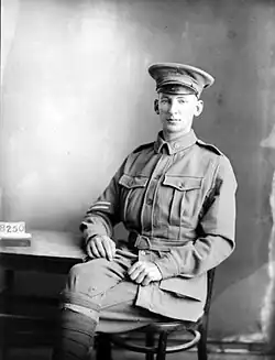 He enlisted in the First AIF on 4 January 1915, and left Australia on 14 April 1915 on the HMAT Wiltshire.[15] He served with the 8th Australian Infantry Battalion in Gallipoli and France, and was promoted to Sergeant on 2 May 1916.