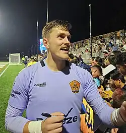 In 2022, he transferred to West Virginia University to play for their men's soccer team for his junior season.[5] He recorded his first victory for the team in his debut on 25 August 2022 against the Robert Morris Colonials.[6] After his junior season, he was named to the Commissioner's Honor Roll.[7] In November 2023, he was named the school's Student-Athlete of the Week[8] and in December he was named to the TopDrawerSoccer National Team of the Week.[9] In his senior season, he set a school record for most goalkeeper wins with 17.[9] After his senior season, he was named to the All-Sun Belt Conference Second Team,[10] the All-Southeast Region Second Team,[11] the Academic All-District Team,[12] and a Scholar All-American.[13]