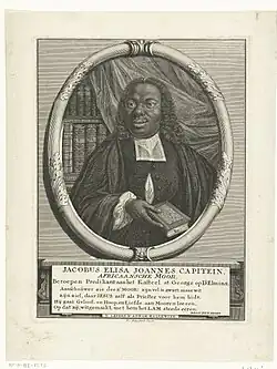 Jacobus Elisa Johannes Capitein (c. 1717 – 1 February 1747) was a Dutch writer, Calvinist clergyman and missionary best known for being the first individual of African descent to be ordained as a minister in an established Protestant church. Born in Western Africa, Capitein was taken to the Dutch Republic at a young age, where he studied theology and wrote on Christianity and slavery before returning to West Africa and eventually dying in debt.