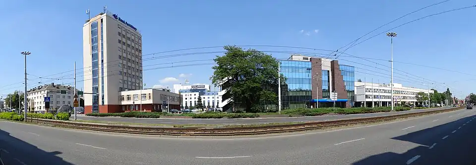 - A 14-storey office building on the corner of Jagiellońska and Konarski streets (1966–1969) by architect Bronislaw Jablonki.[15]