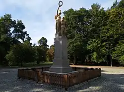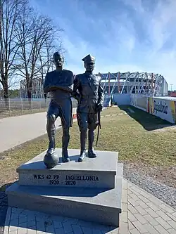 Many players of Jagiellonia fought in defense of Poland during the German-Soviet invasion of Poland, which started World War II in September 1939, and then many joined the Polish resistance movement during the subsequent occupation.[5] Several players were murdered by the Russians in the Katyn massacre in 1940, whereas the fate of vice-chairman Seweryn Nowakowski, who was arrested by the NKVD, remains unknown.[5]