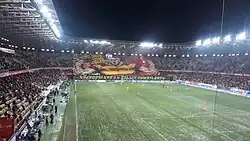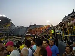 Matches in the second league in Białystok were already averaging 15 thousand viewers. The first match in the return to Ekstraklasa had estimated 35-40 thousand supporters.[22] Every home match following the first was viewed by no less than 20 thousand fans in the stands. Stories from witnesses said they recall buses of supporters come from villages all over the region. The first few seasons did not turn out well for the Białystok team as they finished 8th twice and then 16th, which meant they were relegated. A year later the team lost the playoffs for promotion in a penalty shoot-out against Zagłębie Sosnowiec.[23] In the following year Jagiellonia finished 2nd place earning them promotion to the Ekstraklasa. After only one season in the first league the team was significantly outclassed and were relegated, where they continued to fall to the 4th league. They did not spend much time in the bottom tiers; within 3 years Jagiellonia was back in the second league.