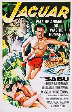 Jaguar is a 1956 American adventure film directed by George Blair and written by John Fenton Murray and Benedict Freedman. The film stars Sabu, Chiquita Johnson, Barton MacLane, Jonathan Hale, Mike Connors and Jay Novello.[1][2][3] The film was released on January 20, 1956, by Republic Pictures.