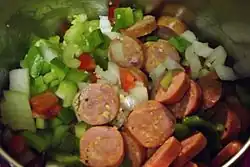 Traditionally, the meat includes sausage of some sort, often a smoked meat such as andouille, along with pork, chicken or seafood (less common), such as crawfish or shrimp. The vegetables are usually a sofrito-like mixture known as the "trinity" in Creole and Cajun cooking, consisting of onion, celery, and green bell pepper, though other vegetables such as okra, carrots, tomatoes, corn, chilis and garlic are also used.