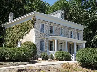 The stone house is situated on 5.8 acres (2.3 ha) at the base of a bluff overlooking the Mississippi River. The two-story structure is a vernacular interpretation of the Greek Revival style. At the same time, it reflects Roman or Jeffersonian Classicism found in the four-columned front porch and carved balustrades, the raised basement, and tall chimney stacks.[2] The exterior walls and foundation are composed of coursed rubble stone that was quarried locally. For the most part, the windows are the six-over-six variety with wood sashes set in rectangular surrounds. They also feature stone lintels and lug sills. The main entrance is topped with a rectangular transom that is broken by two engaged piers and flanked by sidelights. The house is capped with a hipped roof that is sheathed in seamed tin. There are single gabled dormers on the north and south sides of the roof. At the roofline is a plain frieze and overhanging boxed cornice. Sometime before the turn of the 20th century a 1½-story clapboard addition was built onto the rear of the house. It was used as a blacksmith shop and as a summer kitchen.[2]