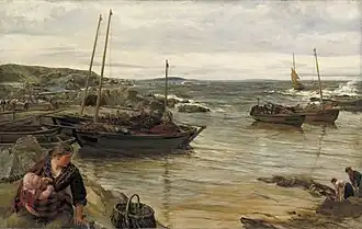 Soon after, he abandoned History Painting and turned his attention to genre depictions in rural landscapes like A Rest by the Wayside and A Few Minutes to Wait before Twelve o'clock (both exhibited 1854). Several visits to Clovelly in Devon prompted him to adopt coastal scenes as his main motif and showed the hardship and rewards of life by the sea. Some early examples are "A Signal on the Horizon" (1857), "A Widow's Son going to Sea," "The Ship-boy's Letter," "Children's Children are the Crown of Old Men," "A Coast-boy gathering Eggs," a scene at Lundy; "Luff, Boy!" (1859), "The Book, Stand Clear! O Well for the Fishermans Boy!" (1860), "Leaving Cornwall for the Whitby Fishing," and "Sea Urchins".[1] He painted these types of scenes so frequently that his coastal paintings were soon dubbed "Hookscapes".