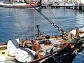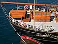 Part of the inspiration for preserving James Craig has been credited to Karl Kortum, then director of the San Francisco Maritime Museum who had also been involved in encouraging Australians to preserve the similar sized barque Polly Woodside in Melbourne in 1962.[5][6] Restoration of James Craig began in 1972, when volunteers from the Lady Hopetoun and Port Jackson Marine Steam Museum (now the Sydney Heritage Fleet) refloated her and towed her to Hobart for initial repairs. Brought back to Sydney under tow in 1981, her hull was placed on a submersible pontoon to allow work on the hull restoration to proceed. Over the next twenty-five years, the vessel was restored. Most of the hull was replaced, being repaired by both paid craftspeople and volunteers. The ship was relaunched in 1997, and restoration work was completed in 2001.