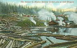 Sharing Holbrook's concern that Oregon's rapidly growing population would have a negative impact on the state's environment, a significant number of Oregonians came to identify themselves as members of the James G. Blaine Society.[8][9] Over time, the society took on a life of its own despite the fact that it had no formal organization, no leaders, no membership roster, held no meetings, and collected no dues. The society's members were self-identified and generally good natured about their isolationist views. However, the success of this tongue-in-cheek group underscored real concerns within the state for issues arising from rapid and uncontrolled population growth.[7][8][10][11]
