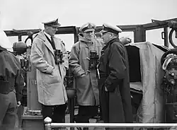 Gornall served in the Second World War, being appointed executive officer aboard HMS Shropshire a month prior to the start of the war.[1] He was appointed Shropshire's commanding officer in March 1941, before being transferred to the shore establishment HMS Kestrel as its commanding officer the following month. Whilst commanding Kestrel, Gornall was promoted to captain in December 1941.[7] His appointment at Kestrel lasted until October 1943, after which he briefly undertook duties aboard HMS Victory and the shore establishment HMS President. At the beginning of 1941, he was placed in command of the Leander-class light cruiser HMS Orion in the Mediterranean Sea, taking part in the Operation Shingle landings which were a prelude to the wider Battle of Anzio. Orion later took part in the Normandy landings in June 1944,[1] and following the landings carried out an effective bombardment in the vicinity of Tilly-sur-Seulles on 10 June.[8] Orion returned to the Mediterranean in 1945, with Gornall hosting Winston Churchill aboard Orion as he awaited the arrival of U.S. President Franklin D. Roosevelt aboard the USS Quincy into the Grand Harbour in Malta, prior to their departure to the Yalta Conference.[9] He was mentioned in dispatches in July and November 1944,[10][11] and was made a Companion of the Distinguished Service Order in the 1945 Birthday Honours.[12]