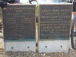 He won the Wakatipu electorate in the 1919 general election, and held it to 1928, when he retired.[2] In parliament he supported construction of the Otago Central Railway to Clyde and then Cromwell, and the breaking-up of large estates.[1] A bridge on what is now State Highway 6 over the Clutha River at Albert Town opened in 1930 and was named James Horn Bridge.[3]