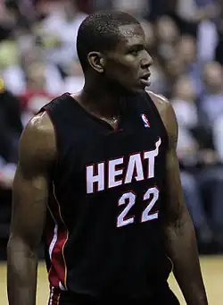 On July 9, 2008, Jones signed a contract with his hometown team, the Miami Heat.[20] He earned $4 million in his first year of a potential five-year contract, worth up to $23.2 million. The first two years were guaranteed, while the final three were options held by both the Heat and Jones.[21] He played in forty games, starting one, for the Heat during the 2008–09 season, averaging 4.2 points, 1.6 rebounds and 15.8 minutes per game. Jones missed 36 games due to right wrist injures and was a DNP-CD six games.[2] He started all seven of the team's playoff games that season.[22] He completed two four-point plays in a span of eleven seconds in a playoff loss to the Atlanta Hawks on April 29, 2009.[23]