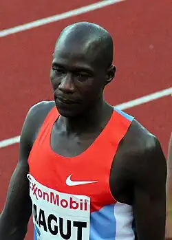 Magut missed the 2011 season due to a knee injury,[8] but returned in May 2012 with a win at the Kenyan Armed Forces Championships,[9] then his first sub-four-minute mile to win at the Prefontaine Classic meeting.[8] He set a new best of 3:50.68 for the distance at the Dream Mile at the Bislett Games a week later – this was only enough for sixth at the higher calibre event, but still ranked him the eighth fastest runner that year.[10][11] He ran a 1500 m personal best of 3:34.60 minutes to place second at the national championship race, but faltered at the Kenyan Olympic trials, coming in sixth place and failing to break 3:40 minutes. This run still earned him a spot on the team for the 2012 African Championships in Athletics, where he took the bronze medal, half a second behind the winner Caleb Mwangangi.[12] Magut came third at the British Grand Prix (his first top three placing on the IAAF Diamond League) and peaked for the season at the Hanžeković Memorial, winning with a personal best of 3:33.31 minutes.[13]