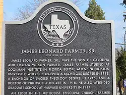 James Leonard Farmer was the son of farm workers and former slaves from Kingstree, South Carolina. His father was Carolina and his mother Lorena (Wilson) Farmer. After limited schooling in Georgia and Florida, Farmer gained a scholarship to Boston University. He earned his bachelor, masters of theology, and doctoral degrees at this institution.[1]