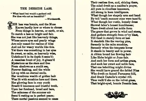 - 1888: The Deeside Lass, and Other Poems.[16] The long poem is the story of the laird’s son Donald who falls in love with the servant girl Jean who had been taken in as an orphan; the laird sees the virtues in Jean, but the laird’s wife is furious, and the pair run off.