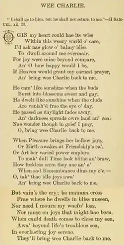 Their first child, Charles, was born in December, 1876. Isabella was born on February 22, in 1879. Just two and a half weeks later, Charles died. His father’s grief was expressed in a most moving poem, "Wee Charlie," below.