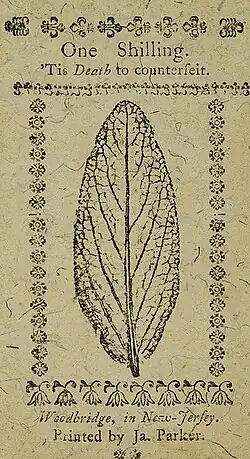 In 1760s, the Woodbridge Township press governed the printing of colonial currency for the crown colony of New Jersey. The Province of New Jersey issued paper money depicting the unit of account for colonial currency reciprocal of the Carolingian monetary system.