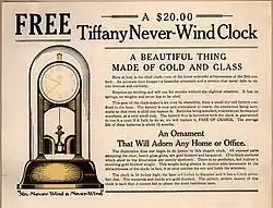 By January 1907, Van Inwagen had moved to New York City, where he was the president of the Tiffany Electric Manufacturing Company[17] Among the products manufactured by the company were never-wind electric clocks. By 1912, Van Inwagen had moved the company to Buffalo, New York.[18] By 1918, some seven models were offered. Though fairly expensive, the "Tiffany Never-Winds" enjoyed success.[19] [20] Van Inwagen was still with the Tiffany Electric Manufacturing Company in 1919.[21]