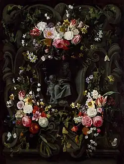 Van Thielen regularly worked on garland paintings in which the staffage was painted by other artists. Garland paintings are a special type of still life developed in Antwerp by Jan Brueghel the Elder and Hendrick van Balen at the request of the Italian cardinal Federico Borromeo at the beginning of the 17th century.[11][12] Other artists involved in the early development of the genre included his master Daniel Seghers, Andries Daniels and Peter Paul Rubens. The genre was initially connected to the visual imagery of the Counter-Reformation movement.[11] It was further inspired by the cult of veneration and devotion to Mary prevalent at the Habsburg court (then the rulers over the Southern Netherlands) and in Antwerp generally.[11][12] Garland paintings typically show a flower garland around a devotional image, portrait or other religious symbol (such as the host).[12] The paintings are usually a collaboration between a flower painter and a staffage painter.