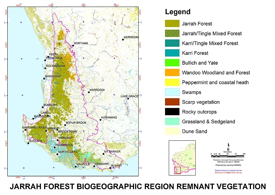 ![]() The IBRA regions, with Jarrah Forest in red | |