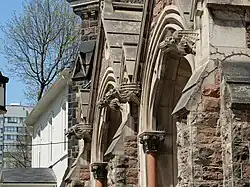 The main façade of the building is made out brown stone that is obtained from the regions of Queenstown.[11] The stone is laid unevenly with a pattern that varies in different shades of browns and dark yellows. The material used for the roof is Canadian slate. The roof is constructed from a series of pitched segments that are centrally connected by a horizontally sliced dome. There are eight entrances, each consisting of solid oak double doors framed with pointed sandstone arches. Several of these doors have been blocked off with black cast iron gates. Triangular sets of small rosette windows are placed above every door to fill the space in between the entrance and the top of the arch. The building has number of columns with slim tall shape and different capitals that are loosely based on a Corinthian order. The capitals are made of gray stone while the columns are of a high quality bronze shaded granite found in St. George, New Brunswick.[11] The main entrance is set under the only tower of the building facing the south west side which serves as a vertical axis to the building. A copper spire sits on top of the tower, adding approximately nine metres (30 ft) to the existing roof height. In addition to the vertical axis the building also has a horizontal symmetry axis that goes diagonally through the building. The flat-roofed extension of the church, built after the 1938 fire, was constructed with red brick masonry which contrasts with the charred Queenston façade.