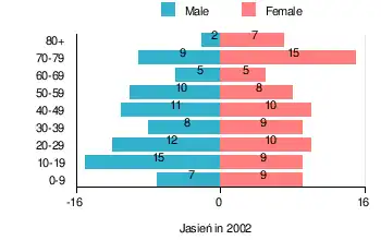 According to the 2002 Poland census, there were 161 people residing in Jasień village, of whom 49.1% were male and 50.9% were female. In the village, the population was spread out, with 23% under the age of 18, 30.4% from 18 to 44, 21.7% from 45 to 64, and 24.8% who were 65 years of age or older.[1]