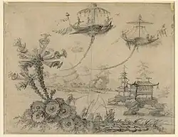 Pillement's illustrations are a mixture of fantastic birds, flora & fauna, large human figures and chinoiserie. He often worked with printmakers such as Anne Allen, who would become his wife.[1] His designs were used by several engravers and decorators on porcelain and pottery, but also on textiles, wallpaper and silver. Pillement had discovered in 1764 a new method of printing on silk with fast colours (recorded in his Memoirs). One of his prime vehicles was the single print marketed independently of an album. He published many albums, one is: Νvre de fleurs, ornements, cartouches, figures et sujets chinois (1776).