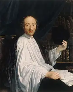 Jean-Baptiste de Santeul was born on 12 May 1630 in Paris, to a good family.[1][a] His father was Claude de Santeuil, a bourgeois merchant of Paris. His uncle, Nicolas de Santeuil, was President of the Finance office of Paris, then Intendant of the Department of Beauvais for twenty years.[2] His mother was Madelaine Boucher. He was one of five children. Three of his brothers, Claude, Charles and Didier, also had distinguished careers.[3] He was first educated at the College of Clermont (later known as College Louis-le Grand). He studied rhetoric under the Jesuit Father Coffard, who discovered his talent for Latin verse.[1]