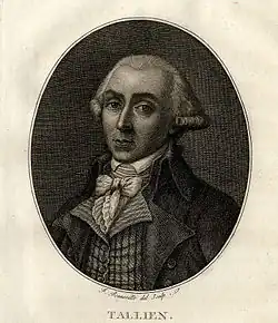 Tallien was born in Paris to Lambert Tallien, the maître d'hôtel of the Marquis de Bercy, and Jeanne Lambert.[1] The marquis, noticing his ability, had him educated, and got him a place as a lawyer's clerk. Supportive of the Revolution, he gave up his desk to enter a printer's office, and by 1791 was overseer of the printing department of the Comte de Provence.[2]
