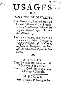 Jean Paul de Gua de Malves (1713, Malves-en-Minervois (Aude) – June 2, 1785, Paris[1]) was a French mathematician who published in 1740 a work on analytical geometry in which he applied it, without the aid of differential calculus, to find the tangents, asymptotes, and various singular points of an algebraic curve.