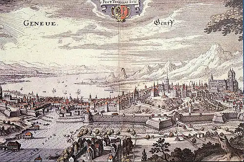 At about the age of 13, de Serres escaped from France into Switzerland to avoid the persecutions and massacres of Protestants that preceded the French Wars of Religion (1562–98).[4] He studied classical literature at the Académie de Lausanne (now the University of Lausanne) in Switzerland from 1557 to 1559, and then theology at the Académie de Genève (now the University of Geneva) until 1566. He was a member of the first class to attend this school, which was founded by Calvin himself. He was next a pastor at the Reformed Church of Jussy.