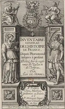- Inventaire de l'Histoire de France, 1597. This work, written while he was working as historian to the king, was frequently reprinted with additions. Translated into English with later additions as John De Serres, A Generall Historie of France (London, Eld and Flecher, 1624).