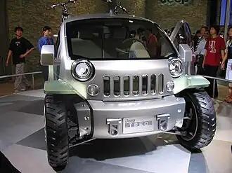 The Jeep Trio was produced to appeal to the young urban market in Asia and was unveiled at the 2003 Tokyo Motor Show.[5][6] The design was promoted as a vision of urban driving “a decade or more” in the future.[1] The concept car was well received by motor journalists and a production vehicle was planned powered by a petrol/electric hybrid drivetrain to be launched by 2008.[7] However, the vehicle remained a one-off build.[5]