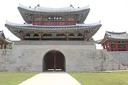 Pungnam Gate is the south gate of the city wall that enclosed Jeonju during the Joseon Dynasty.[16] It was the only remaining gate after the destruction of the wall. Pungnam Gate was designated as the National Treasure #308 on 21 January 1963.[17] Jeonju was the provincial governor's capital during the Joseon Dynasty, so it had a set of fortifications to enclose the city. It had gates in all 4 directions, but all of them were demolished in 30th year of King Seonjo's rule (1597).[18] After 3 years of repair work starting in 1978, the Pungnam Gate was restored. The column arrangement of the gate, especially the part located on the second story, is a very rare Korean building style.[19]