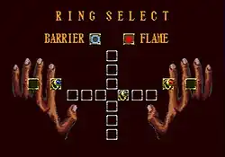 Jewel Master is an action-adventure game in which the player traverses side-scrolling levels with the aid of elemental rings. Its plot starts when a demonic king begins to conquer a large portion of a kingdom with his armies.[3] This eventually leads to an unnamed mage going on a journey to destroy them with the combined strength of his rings. There are four types of elemental rings which each correspond to either fire, water, wind or earth magic. The rings are equipables that offer special effects and can be switched around at any point in the game. The effects can be assigned to one of two buttons, represented by two hands in-game. Depending on the rings equipped and where they are assigned, the effect that happens when the buttons are pushed changes. Most effects initiate different kinds of attacks but others can change how the Jewel Master traverses the stage. For example, a wind magic ring can be equipped to allow the Jewel Master to double jump. Some attacks can be more or less effective at defeating enemies.[4]