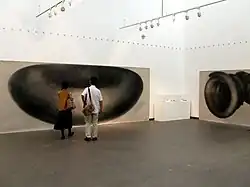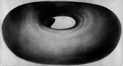 This shape also offers the possibility of mathematical transformation, during which the whole object can be turned inside out through eversion (like From nowhere to nowhere, 1990–1997), to work in a 4D space and to decrease the central space through shortening of the axis, leading to final degeneration into a sphere. (It, charcoal on cardboard, 220 x 480 cm, 1989–92).