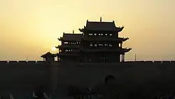 The fortress at Jiayuguan is situated at the end of the portion of the Great Wall of China which was built by the Ming Dynasty, in the 14th century.[5]
