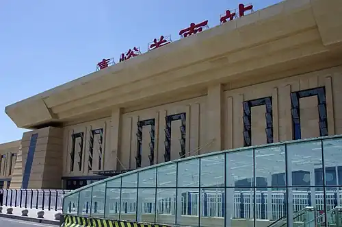 Jiayuguan South railway station (Chinese: 嘉峪关南站; pinyin: Jiāyùguān Nán Zhàn) is a railway station located in Jiayuguan, Gansu Province, China. It was put into operation on December 26, 2014.[1][2][3] It serves the Lanzhou–Xinjiang High-Speed Railway with High Speed services between Lanzhou and Urumqi and conventional services connecting Urumqi to various cities in Eastern and South Western China. It is the second major railway station serving Jiayuguan, with Jiayuguan railway station, which serves the conventional Lanzhou-Xinjiang Railway.