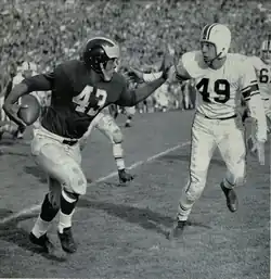 Pace attended the University of Michigan and played for the Michigan Wolverines football. He was named the Most Valuable Player on the Michigan football team.[4] He was also awarded the Chicago Tribune Silver Football as the Most Valuable Player in the Big Ten Conference.[5] He also ran track at Michigan and won the Big Ten 60-yard indoor dash title.[2] In 1957, he scored ten touchdowns: seven rushing, two receiving, and one punt return. He accumulated almost 800 yards of total offense in 1957 (664 rushing, 122 receiving and 98 on punt returns) and averaged 5.4 yards per carry rushing.[2] In the 1957 Michigan-Ohio State game, Pace rushed for 164 yards and caught a 14-yard pass,[6] which was at that time the Michigan record for rushing yards against Ohio State. Pace played in the 1957 East–West Shrine Game.[3] He was also selected by the Associated Press as a first-team player on the 1957 College Football All-America Team.[7]