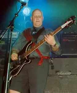 Smith realised that music could become his life from the momentum of do it yourself punk.[11] He co-founded the band that would become Cardiacs, Cardiac Arrest, with Tim in 1977,[12][13] along with Michael Pugh on vocals and Peter Tagg on drums.[14] The Smith brothers were the only constant members in the band's regularly changing lineup.[15] Jim played bass and backing vocals,[12] though he allegedly couldn't play an instrument.[16] Tim—the leader of the band[17]—originally took on guitar and backing vocal duties before a personnel change saw him promoted to frontman.[18] According to Cardiacs' official history, happily unreliable folklore,[19] Tim intended to make Jim "look as foolish as possible on stage" to punish him "for all the unkind things he would do to him as an infant".[9] The idea was to play unpalatable, unpopular music and therefore humiliate Jim, forming the band as revenge.[19] On Cardiac Arrest's first album, the cassette-only release The Obvious Identity (1980),[20][21] Jim was credited as "Patty Pilf".[22] On the second Cardiacs cassette, Toy World (1981), Jim co-wrote the album's lyrics with Tim and Cawthra.[23]