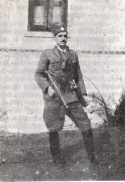All Chetniks were considered as enemies by Axis occupiers Yugoslavia who managed to reach quid pro quo arrangements with Chetniks, that allowed them to fight against communist revolutionary irregular forces.[5] In Slovenia, Mehaler and his detachment were exemption from that kind of arrangement.[6] According to some estimates, Štajerska Chetnik detachment was the only anti-Communist military unit that consistently attacked Axis occupiers throughout the war.[7] The detachment under Melaher's command had 200 men.[8] In October 1942 Gestapo arrested Melaher, but he managed to escape and continued his struggle.[9] Melaher successfully recruited many of his men among Slovenian deserters from German units.[10]