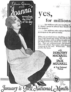 Joanna is a 1925 American silent romantic comedy film produced and directed by Edwin Carewe and distributed by First National Pictures. The film was based on the short story "Joanna, of the Skirts Too Short and the Lips Too Red and the Tongue Too Pert" by Henry Leyford Gates.[1] The film starred Dorothy Mackaill and Jack Mulhall and marked the first motion-picture appearance of Mexican actress Dolores del Río.