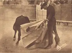 Rodríguez's alternativa was confirmed, despite various débâcles earlier in this season, on 21 June (or 22 June — sources differ) that same year at Las Ventas in Madrid. Standing as "godfather" this time was the Madrid bullfighter Victoriano Roger Serrano "Valencia II", while Marcial Lalanda bore witness. Bulls were supplied that afternoon by the Doña María Montalvo ranch, and the bull used for the ceremony was named Naranjo ("Orange Tree").[4][8][9] He appeared at 46 corridas in the 1927 Spanish bullfighting season, and knew both triumphs and humiliating defeats: ten of the bulls that he faced were sent back to the bullpen after he had failed to slay them. He thus became a bullfighter to whom nobody was indifferent; for better or for worse, he aroused passions.[10] This, Rodríguez's first bullfighting season as a fully-fledged matador, swung between resounding successes and stunning failures, a pattern that was to be repeated throughout his career.[8] One of his greatest failures came on 25 August 1927 in Almagro; this was the one that gave the Spanish language a now common expression referring to a lamentable failure (see "Quedar como Cagancho en Almagro" below).[14] He also appeared at 10 corridas in Mexico that year.[7]