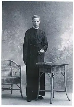 Intending to join the Carthusians as a teenager, as he was drawn to the life of quiet contemplation, he was convinced instead by the local ordinary Leopoldo Ruiz y Flóres, the Archbishop of Michoacán, that his talents were more suited as a "soldier for Christ" in the Society of Jesus.[9] He set sail to Spain in 1916 and after visiting the Sanctuary of Loyola at the birthplace of St. Ignatius of Loyola, he entered the Jesuit seminary at Santander.[9] His brother Luis Sáenz y Arriaga had been ordained a priest in 1911 after having studied at the Pontifical Latin American College (though he died in 1917 after contracting typhus while aiding needy patients).[10]