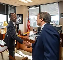 On November 6, 1990, 49th ward alderman David Orr was elected Cook County Clerk, creating a vacancy in the Chicago City Council until the 1991 municipal elections. Chicago's Mayor appoints replacements to fill short-term vacancies in the City Council. Orr supported Moore as his replacement.[2] Mayor Richard M. Daley appointed Robert Clarke, a law associate of Illinois State Representative Lee Preston, the 49th ward Democratic committeeman.[3][4] Moore was among the challengers to Clarke in the February, 1991 municipal elections. No candidate received a majority of the votes, requiring a run-off between the top two, Moore and Clarke, in April, 1991.[5][6] Orr was Moore's campaign chairman.[7] On April 2, 1991, Moore was elected alderman. Of eight incumbent alderman who were originally appointed by Daley to fill vacancies, Clarke was the only one to fail to win re-election that year.[8]