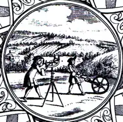 which to a modern surveyor seemed incredibly bad.[14] Measuring chains were not corrected for temperature. For longer distances a measuring wheel called a perambulator (see illustration) was used.