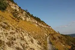 On the southern edge of the plateau, from the southern end of the western hillfort to the edge in the west, an approximately 35 m long, much lower hillfort has survived. A sketch from 1884 and a drawing from 1912 also show a hillfort at the transition from the trapezoidal plateau to the spur, where today only a clear terrain edge can be seen.[4] According to the older plan, the plateau was even surrounded by hillforts on all sides. Probably the low hillfort is the remainder of an edge fortification, which was preserved on the somewhat less rugged steep slope to the south here.